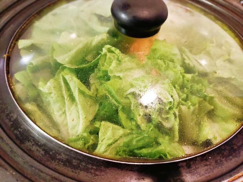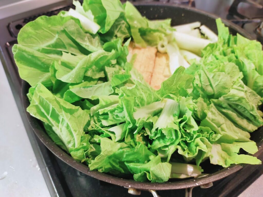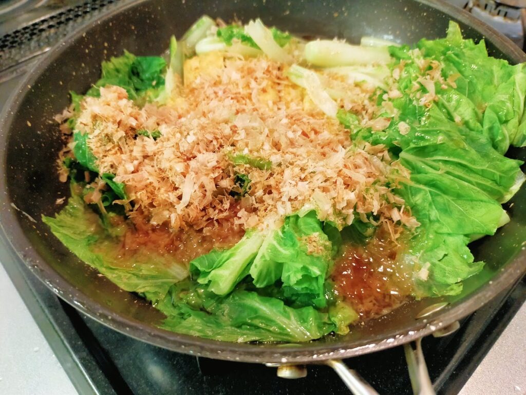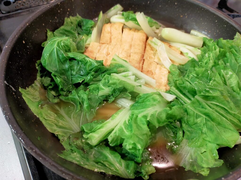 - フライパンに厚揚げ、しろな、すべての調味料を入れます。もりもりではみ出してるけど~