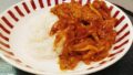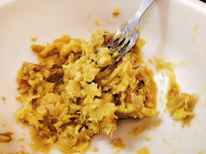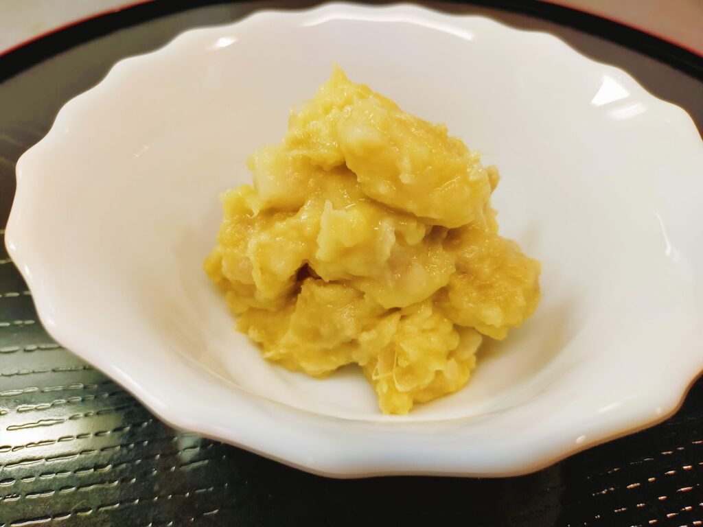 2. スイッチが切れたら、サツマイモのあら熱を取って、皮をむいてフォークでつぶします。この時に味見をして甘さが足りなければお好みの量の砂糖を入れて混ぜます。