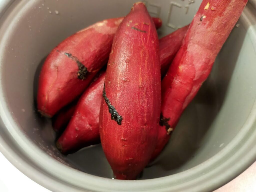 1. サツマイモは洗って炊飯器に入れて、1.5合の目盛まで水を入れて、炊飯モードでスイッチを入れる。