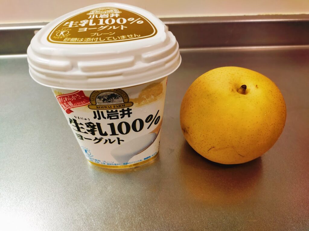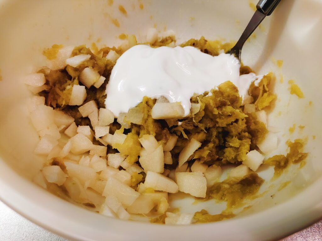 3. 2が冷めたらナシを細かく切って入れて、ヨーグルトを少しづつ加えて混ぜて、冷蔵庫で冷やせば出来上がり。