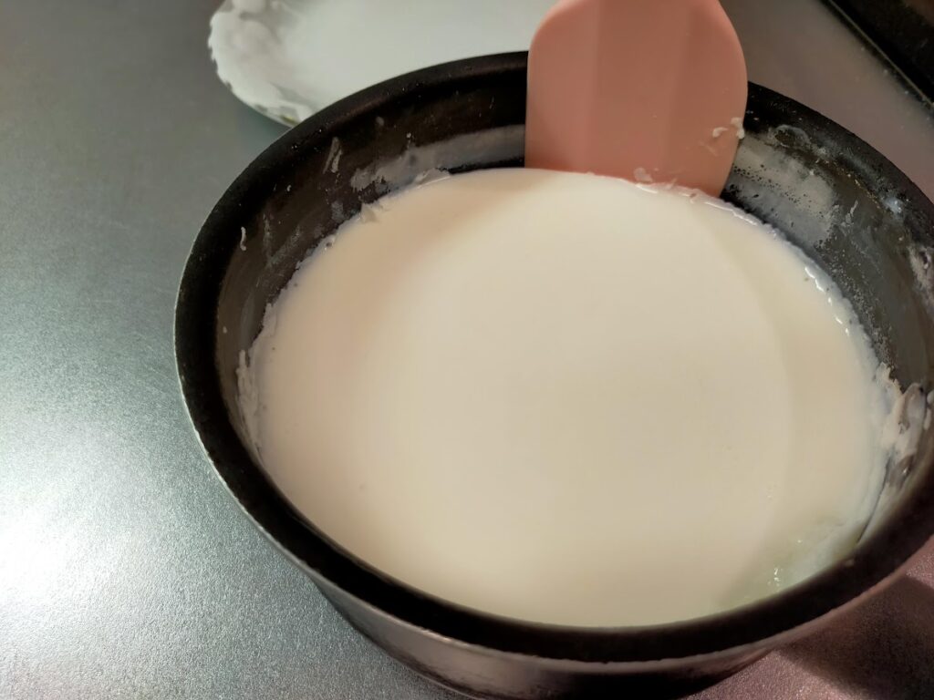 - 冷蔵庫から出して、ヘラを鍋のふちにそわせて