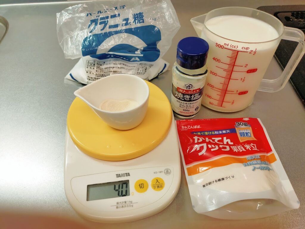 寒天・・・・・4g(小袋で売っているクイック寒天は1袋が4gなので便利ですよ)
