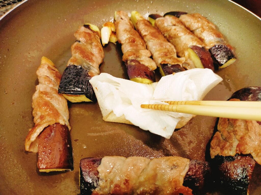 7. いったん火を止めてから6のフタをあけて、余分な油をペーパーでふき取ります。