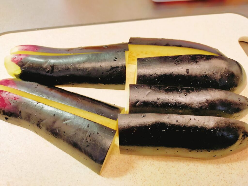 1. なすを8等分(肉の枚数分)になるように切って、ボールに塩大さじ1(分量外)と水を入れた中につけて、アク抜きをします。