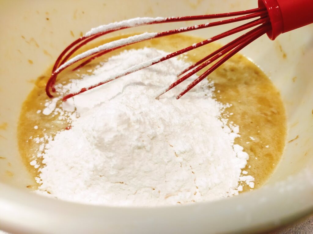 - 最後に米粉とベーキングパウダーを加えて、混ぜ合わせます。