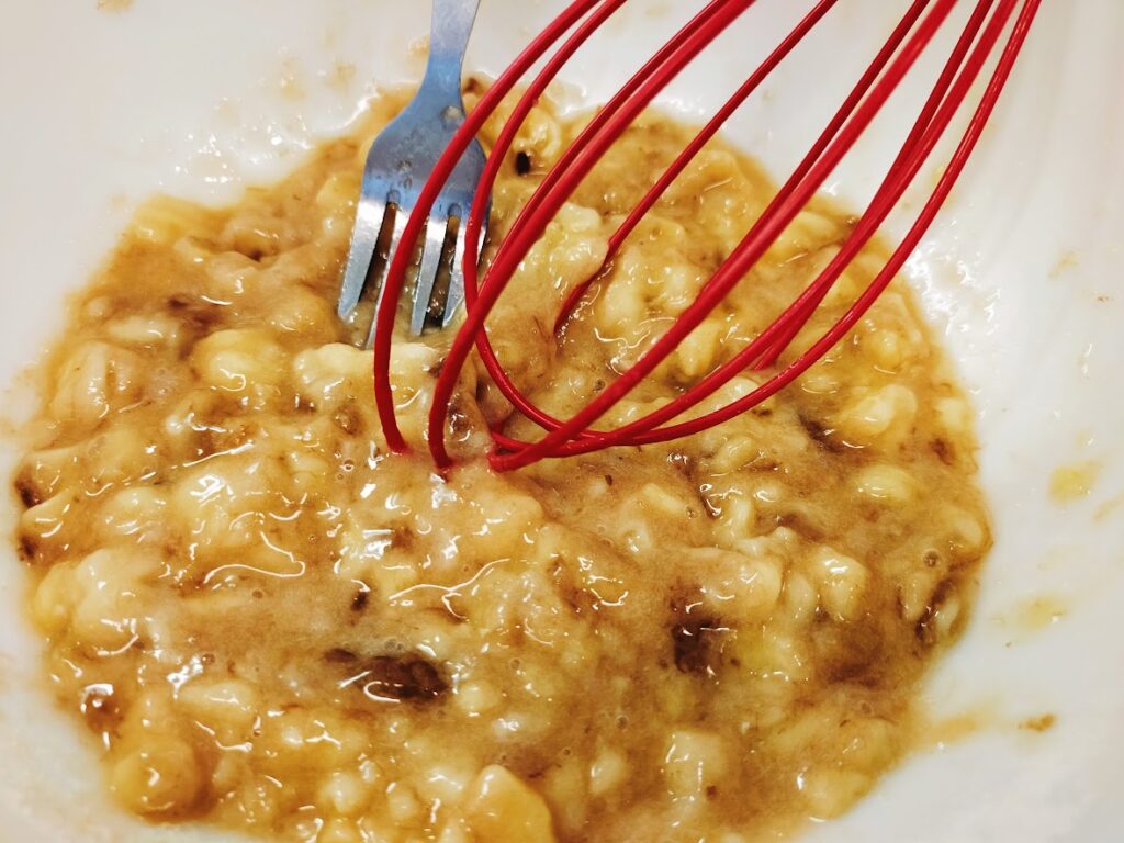 - ボールにバナナと砂糖、塩3ふり(分量外)を入れて、フォークかホイッパーでつぶしていきます。