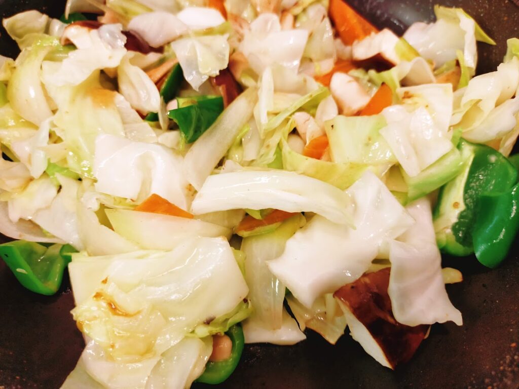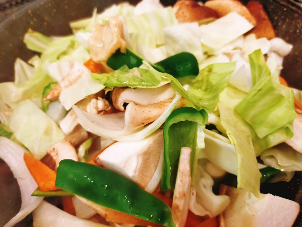 - 3のフライパンに野菜を入れ、軽く炒めたら中華の素と水大さじ2を入れて炒め合わせます。