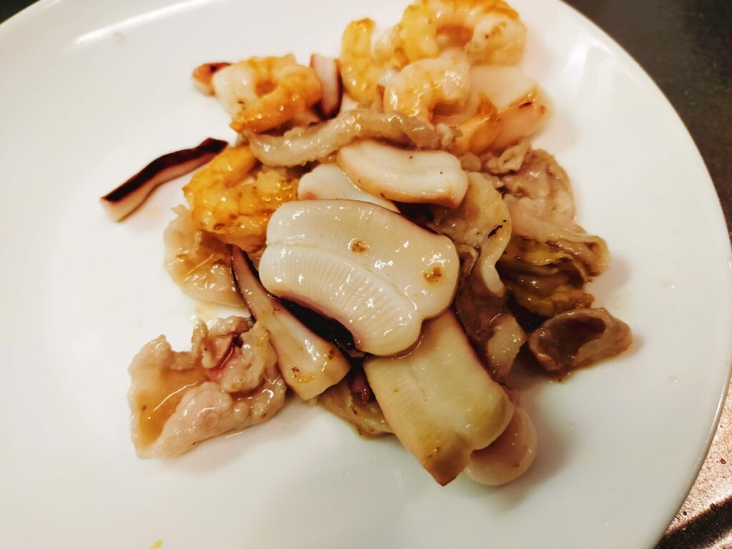 - 豚肉、シーフード(なくてもOK)に塩コショウ少々と片栗粉小さじ1をふり入れて混ぜます。