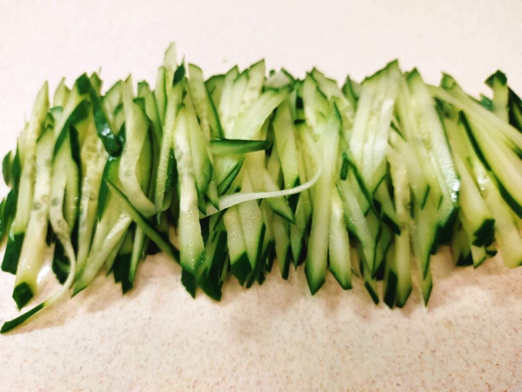 - その間に、きゅうりを細切りにします。