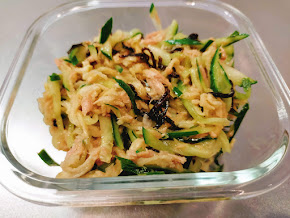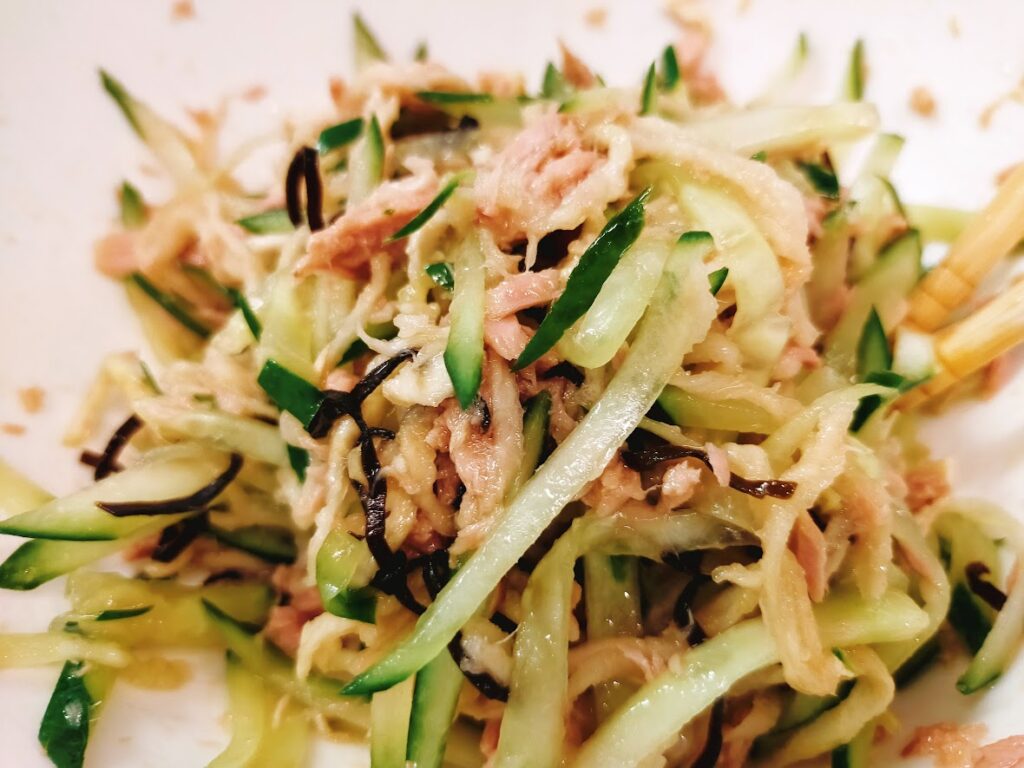 - 3に2のきゅうりをぎゅっとしぼりながら入れて、ツナ缶(油も一緒に)と塩昆布、ポン酢、ごま油を入れて、混ぜ合わせます。