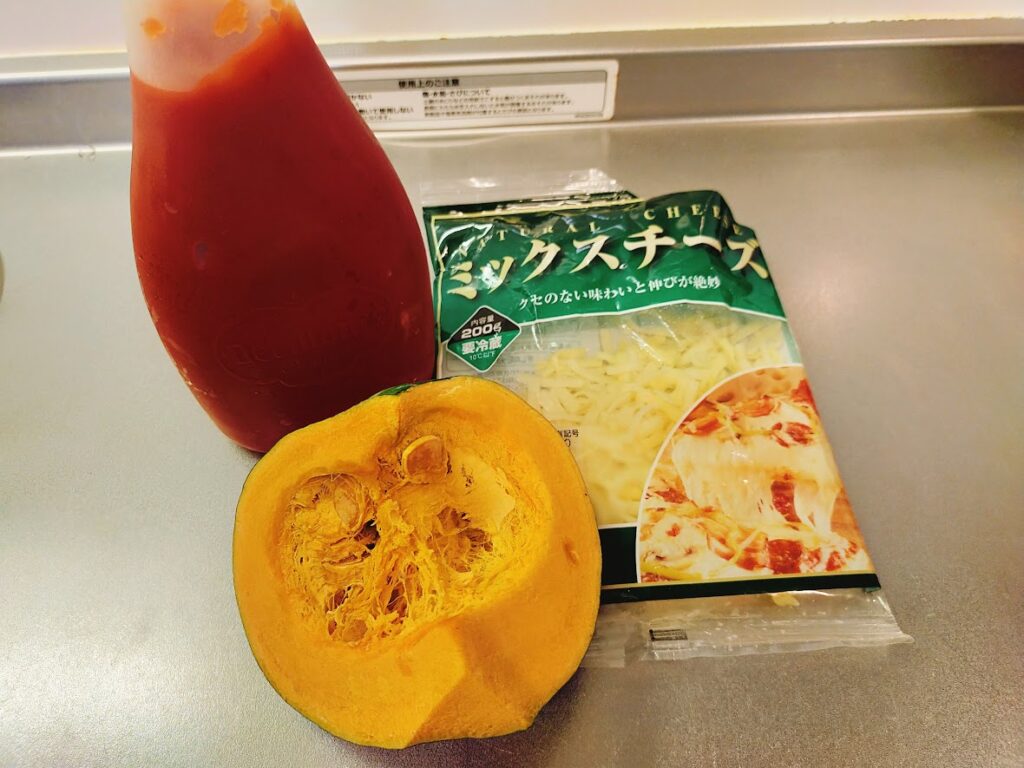 - かぼちゃは種を取って洗って、ラップに包んで600wで2分チンします。