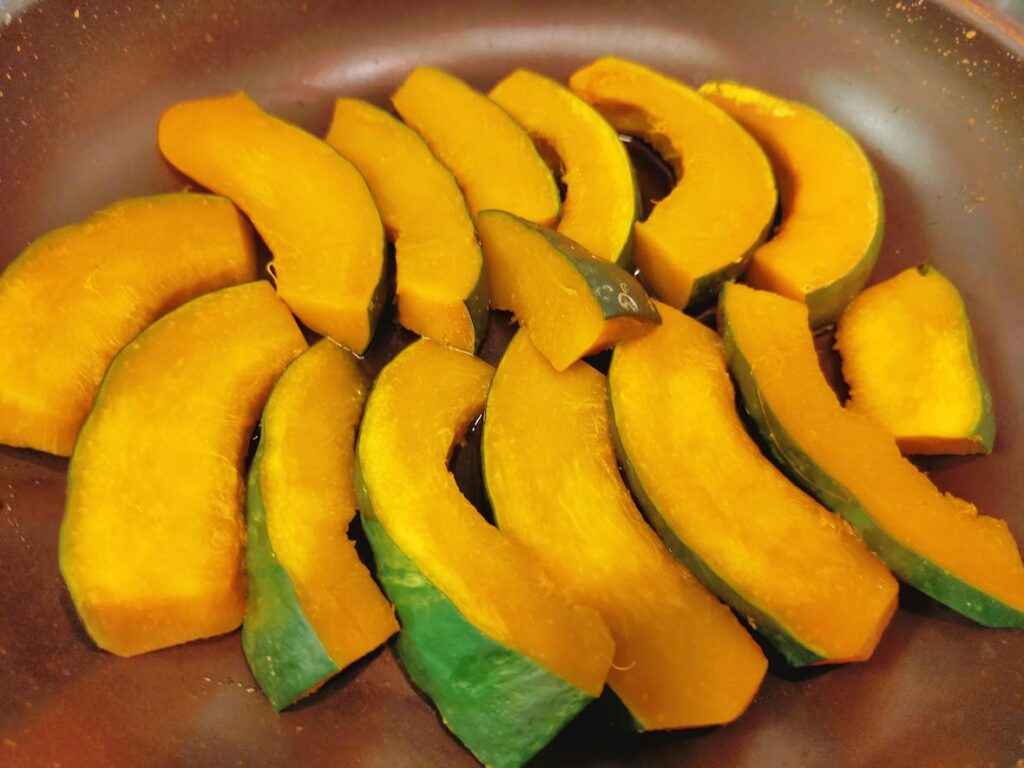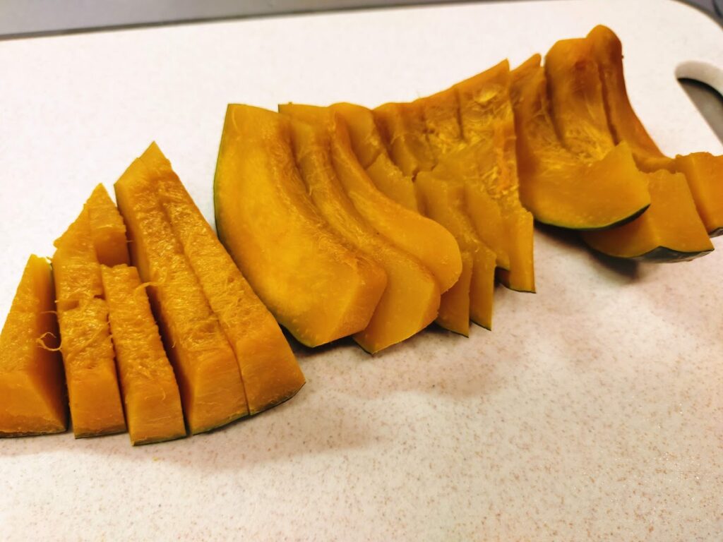 - かぼちゃは、そのまま切ってじっくり焼いても良いのですが、レンチンすると簡単に安全に切れます。