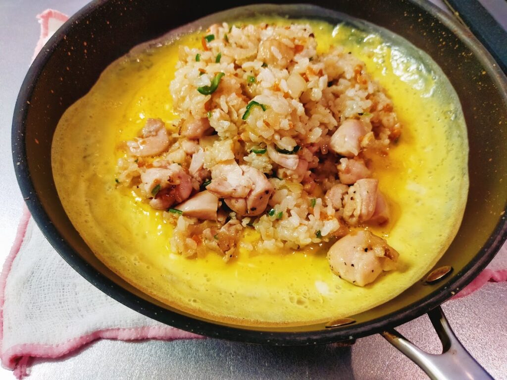 - フライパンに卵を広げて真ん中が半熟になったら、再びフライパンをふきんの上に乗せて6のチキンライスの半量をそっと入れていきます。