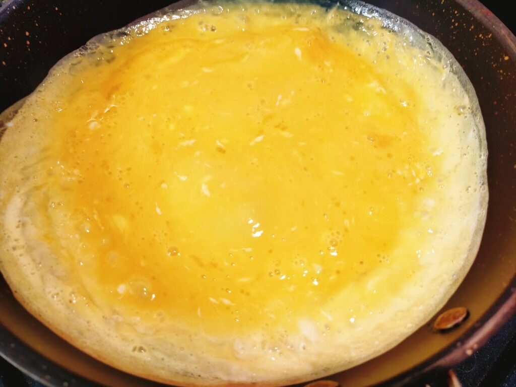 - 8の熱くなったフライパンを9のふきんに3秒置き(ジュッと音がします)火のついたコンロに戻してから卵を流し入れます。