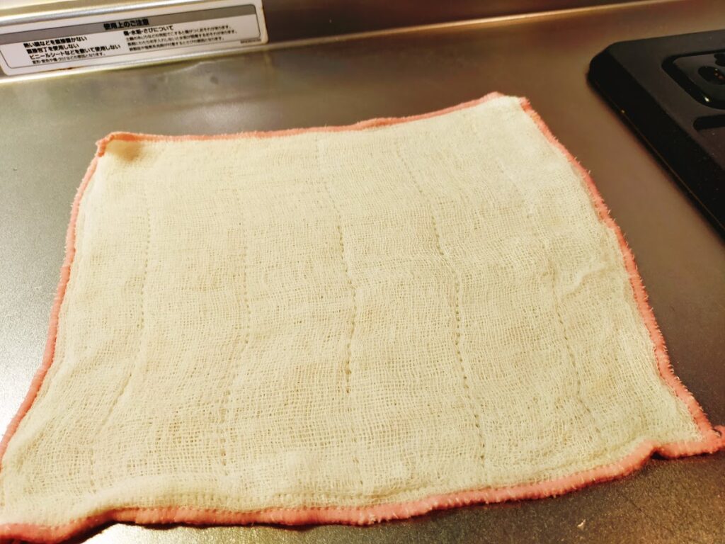 - 温めている間に、ふきんを洗って軽く水をしぼり広げて置いておきます。