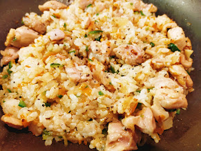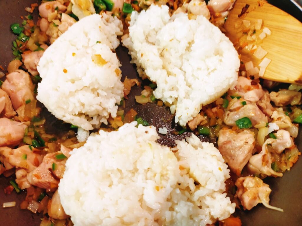 - ご飯とコショーを加えて、切るように混ぜていき、チキンライスの完成。