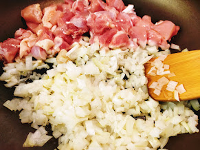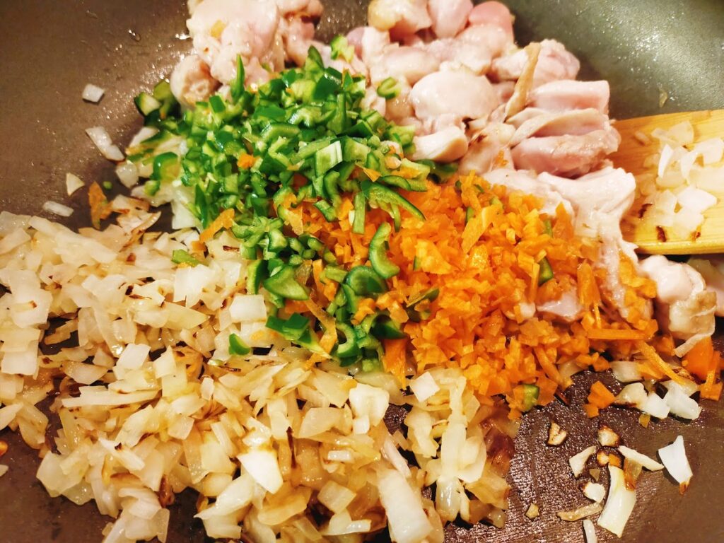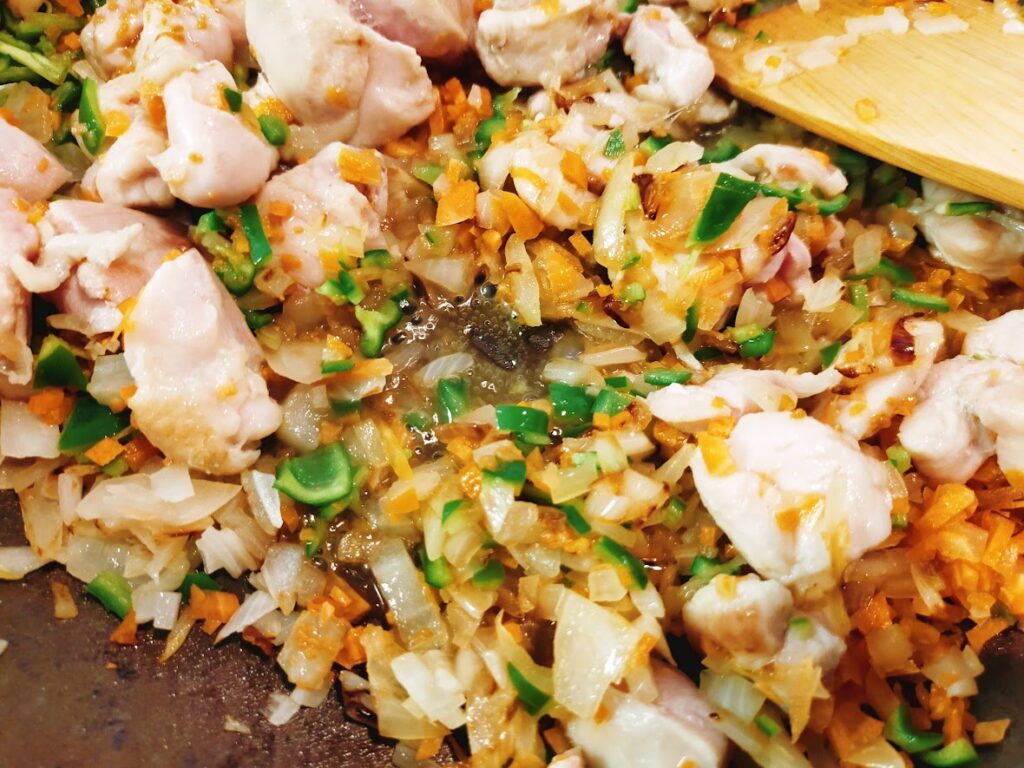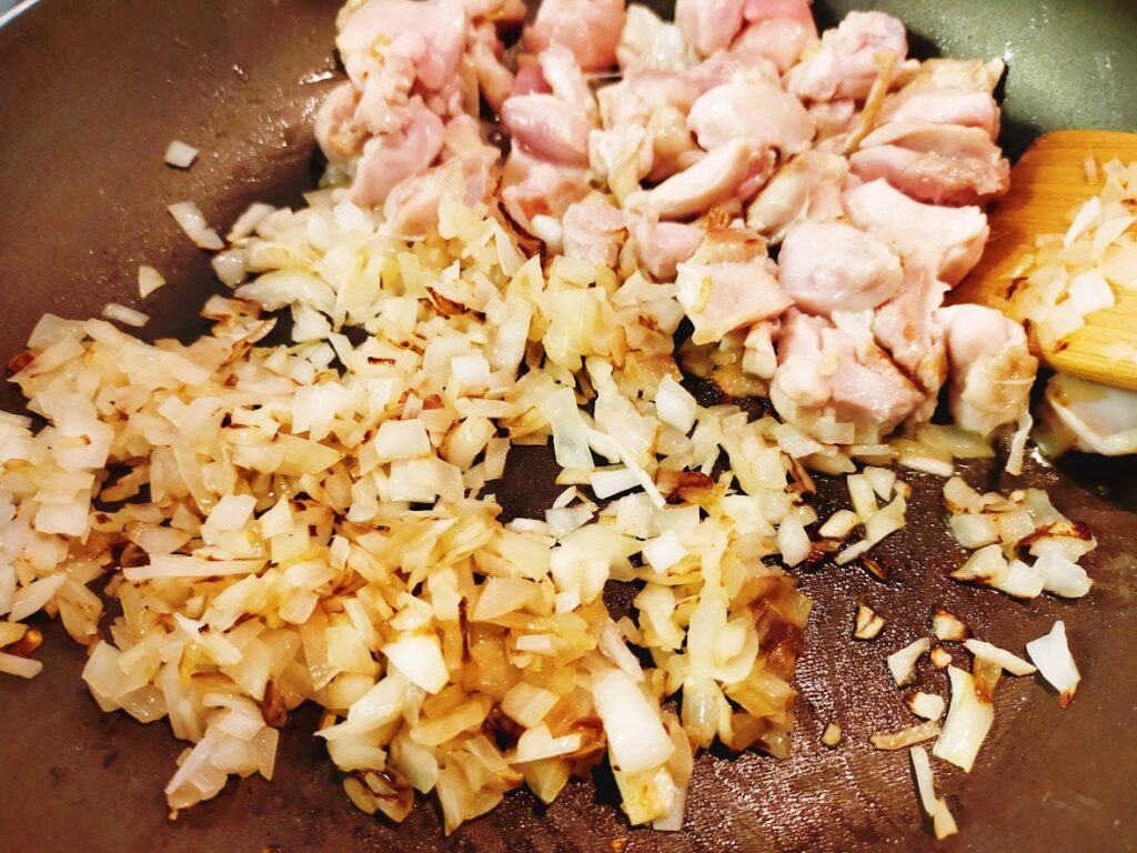 - 玉ねぎを混ぜて茶色っぽくなるまで炒めていき、鶏肉は焼き目がついてからひっくり返して炒めていきます。