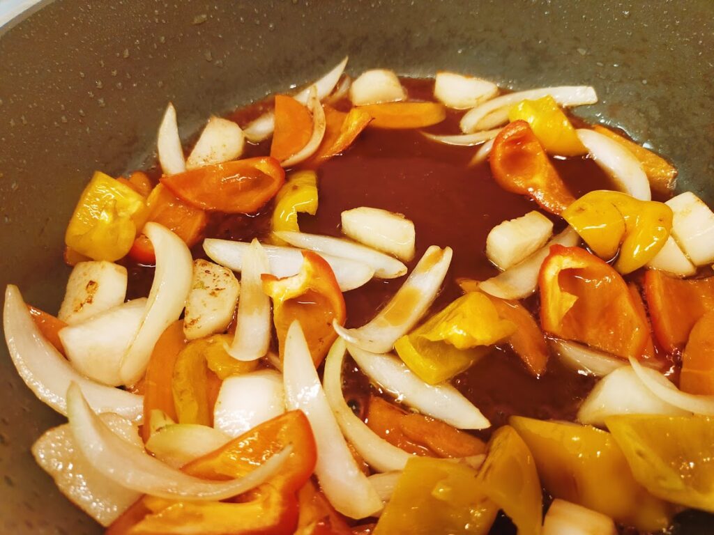- 甘酢あんの材料をもう一度しっかり混ぜてから(底に片栗粉がたまっているので)9のフライパンに入れて火をつけて(中火)とろみがつくまで混ぜながら熱します。