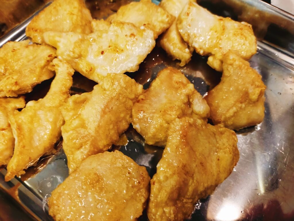 - フライパンに油大さじ4を入れて、2の鶏肉を並べて入れてから中火にかけます。