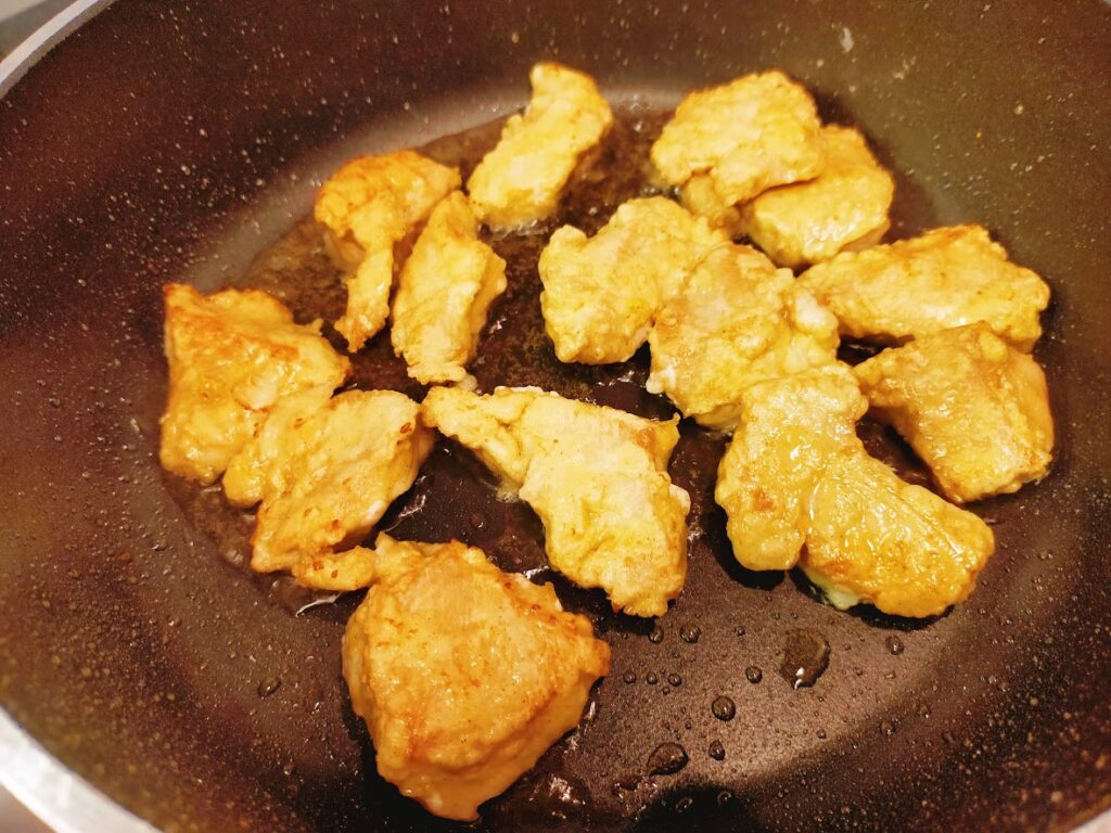 - 温度が上がって、鶏肉のまわりが白っぽくなるまで触らずに見守り、まわりが白っぽくなってきたら、ひっくり返してこんがり焼き色が付いていれば、全て裏返して1分熱したら火を止めて、いったん取り出します。