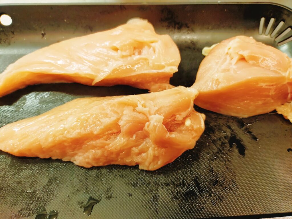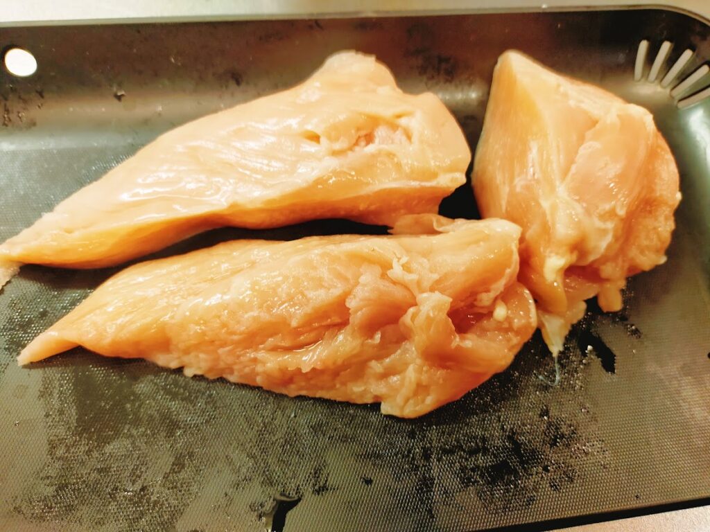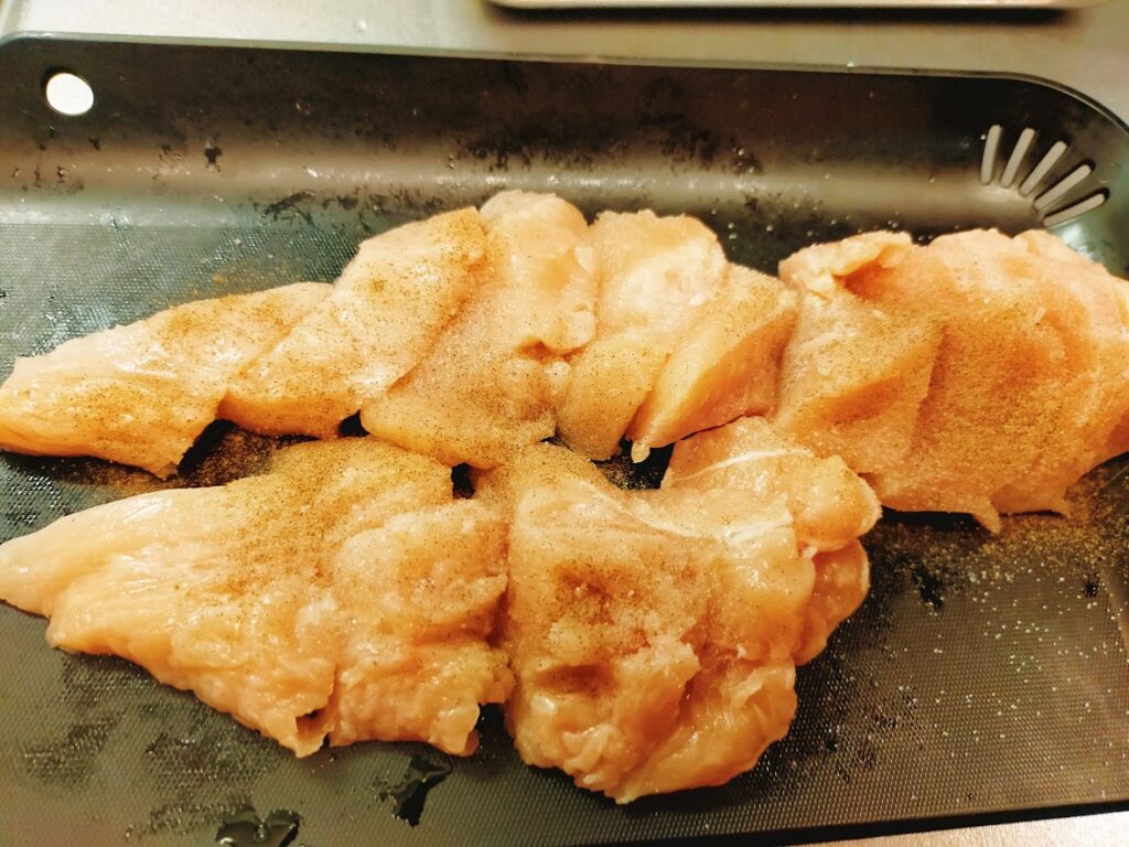 - 鶏胸肉は皮を取ってから、やや薄めの一口大に切ってから、軽く塩コショウします。