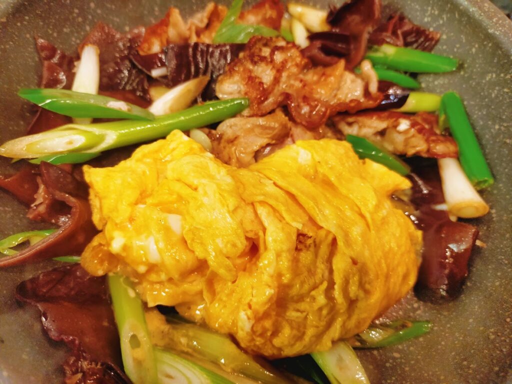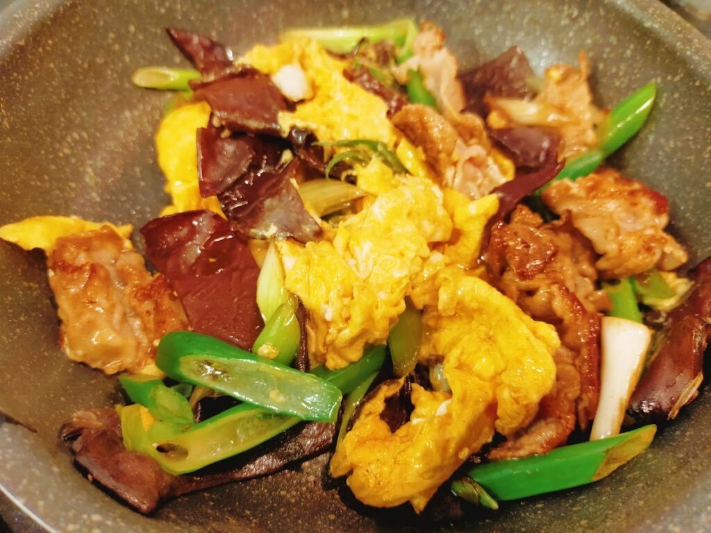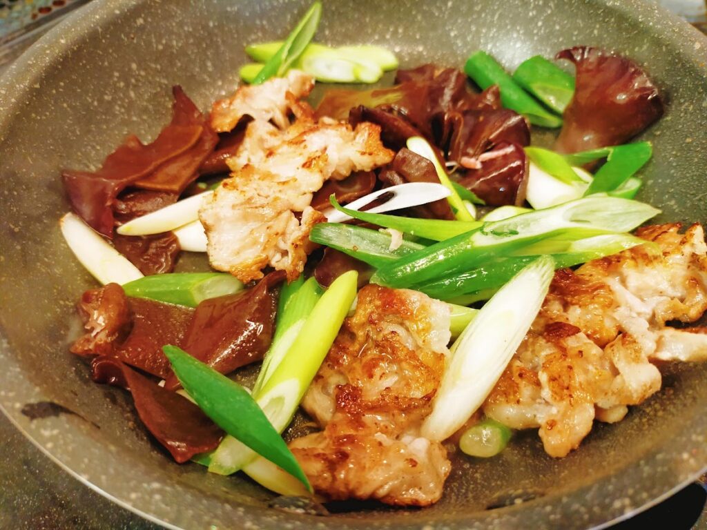 - 4にきくらげとねぎを入れて、炒め合わせてから、酒としょうゆを入れます。