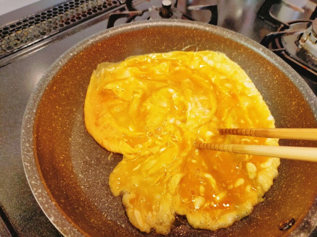 - フライパンに油を入れて中火にかけ、油が熱くなったら、2の卵を一気に入れて、ふちから大きくかき混ぜて、いったん取り出します。