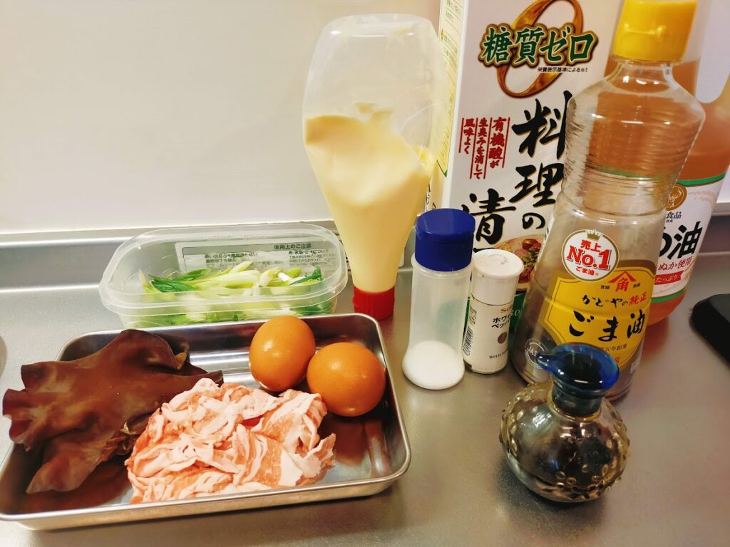 - きくらげと豚肉を食べやすい大きさに切り、ねぎも斜めに切ります。