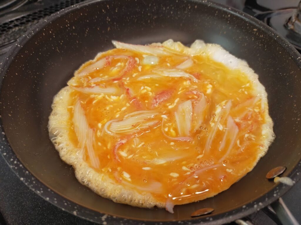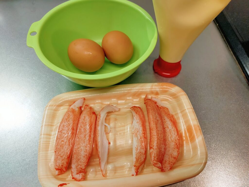 - 卵をボールに割り入れて、マヨネーズをひと回し、塩少々、カニカマを適当に割いて入れて、軽く混ぜ合わせます。お箸で10回くらい混ぜて
