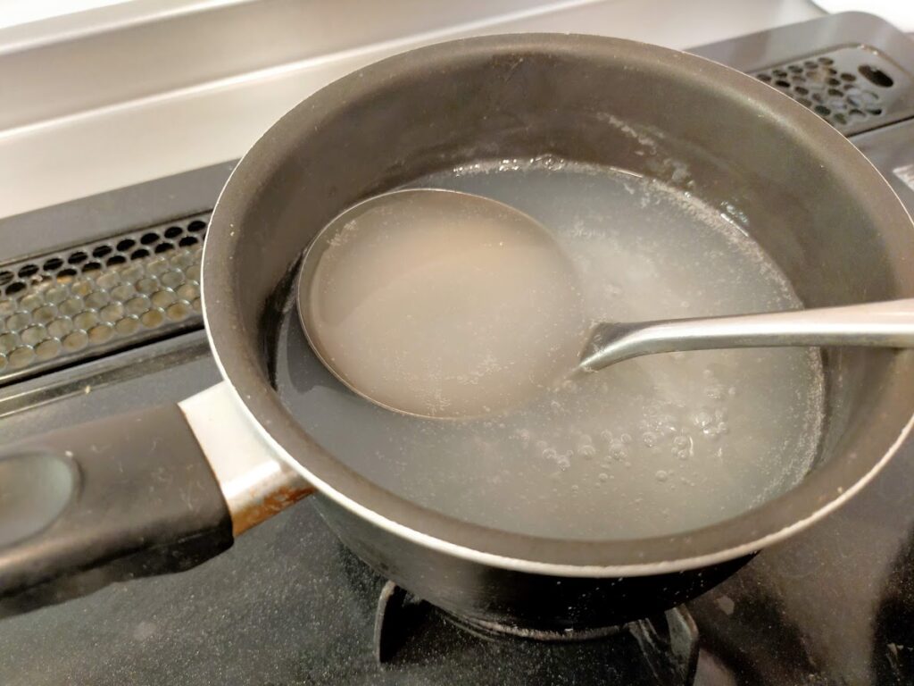 - 先に、鍋に鶏がらスープの素を水に入れて火にかけます。(この時、味見して味が薄いと感じたらスープの素を足して調整してね)