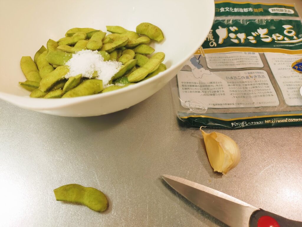 - 枝豆が色づくまで炒めて、1つ取り出して火が通っているのを確認して、塩を適量ふりかけて出来上がり。
