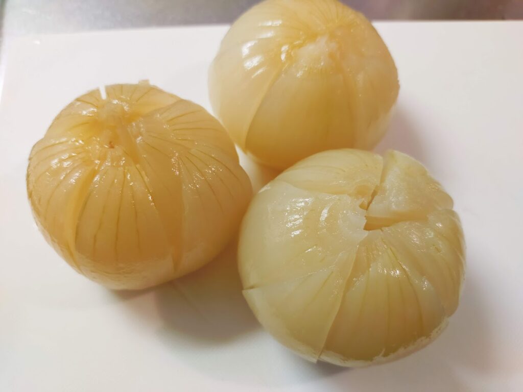 - あら熱が取れたら、皮をむいて食べやすく切り目を入れます。