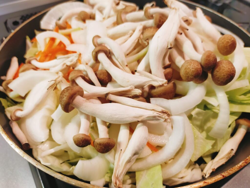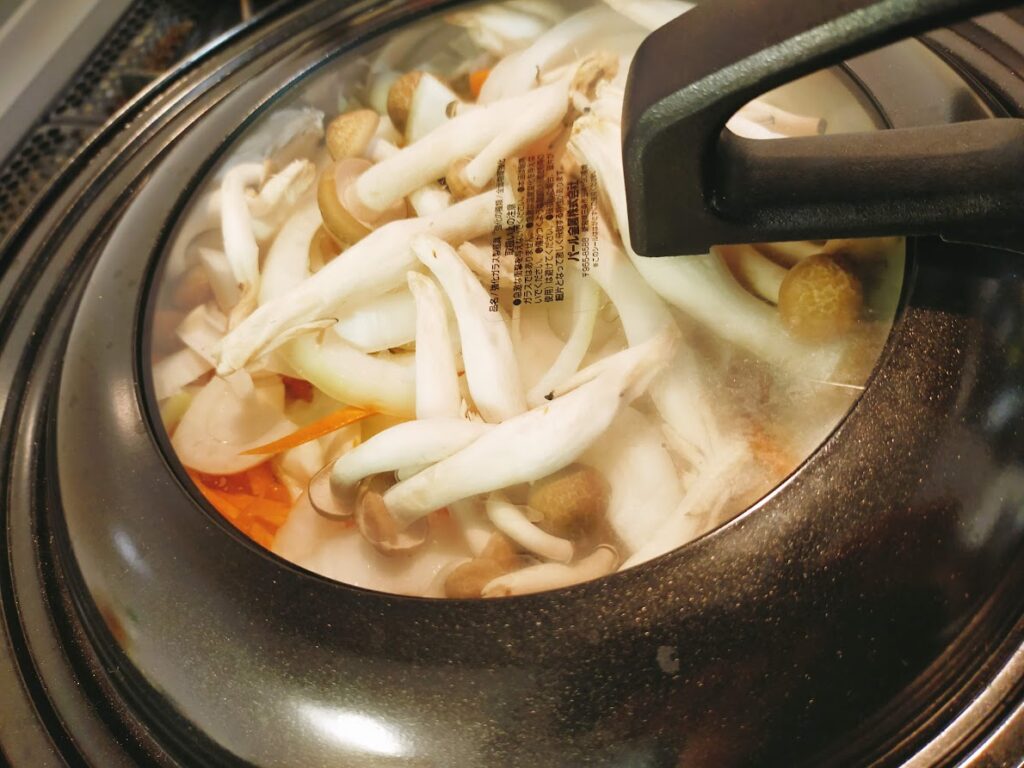 - 2に水大さじ2を入れてフタをして火をつけて(中火)蒸し焼きにする。