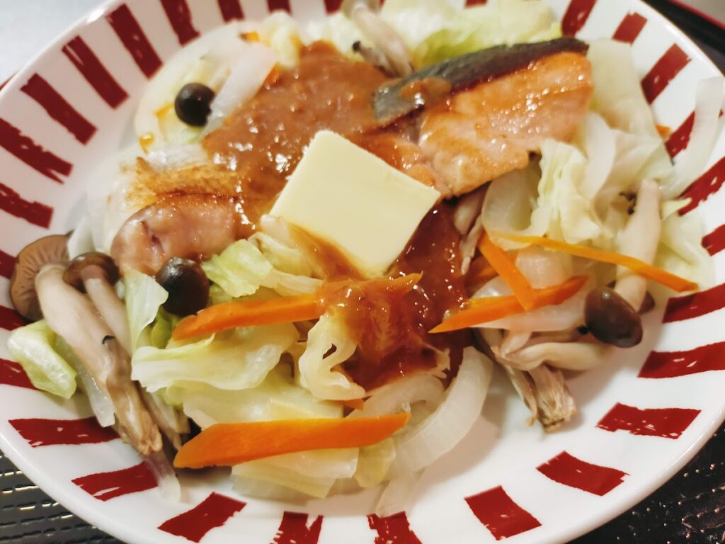 - お皿に蒸しあがった野菜を盛り付け、焼いたサケをのせて、6とバターを乗せる。