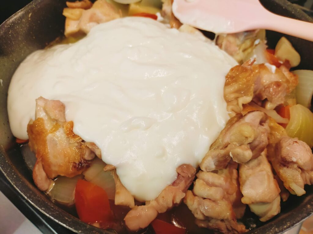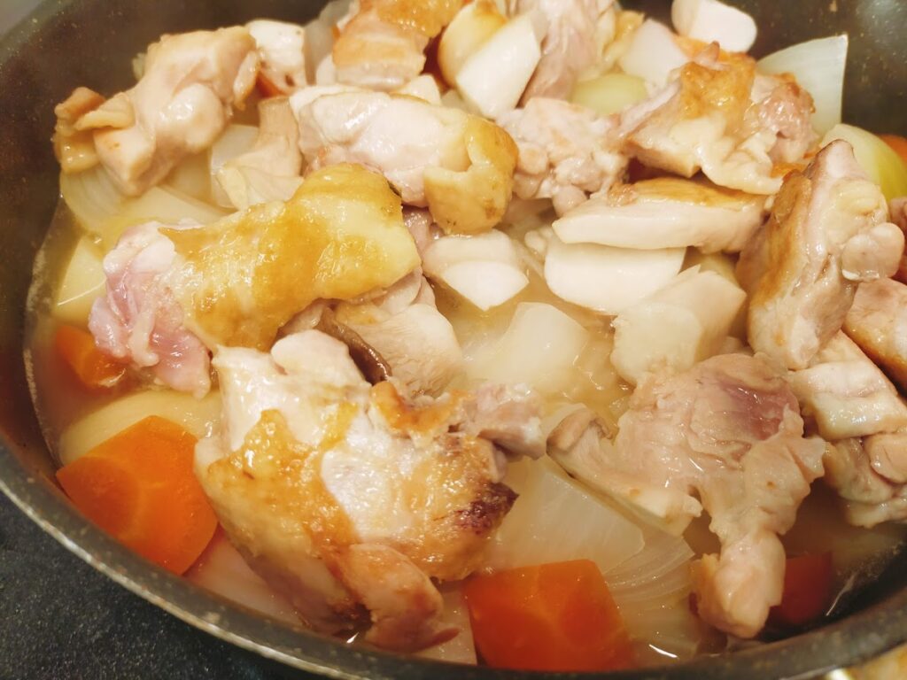 - 鶏肉の皮目がこんがり焼けたら火を止めます(鶏肉に完全に火が通らなくて大丈夫です)