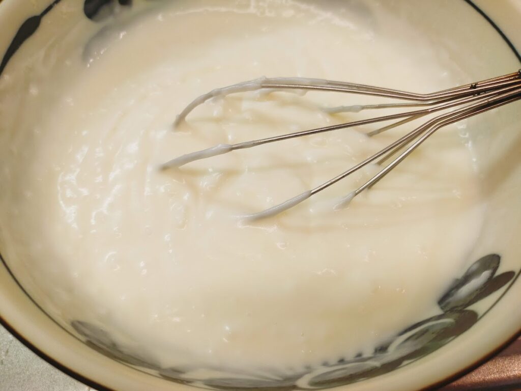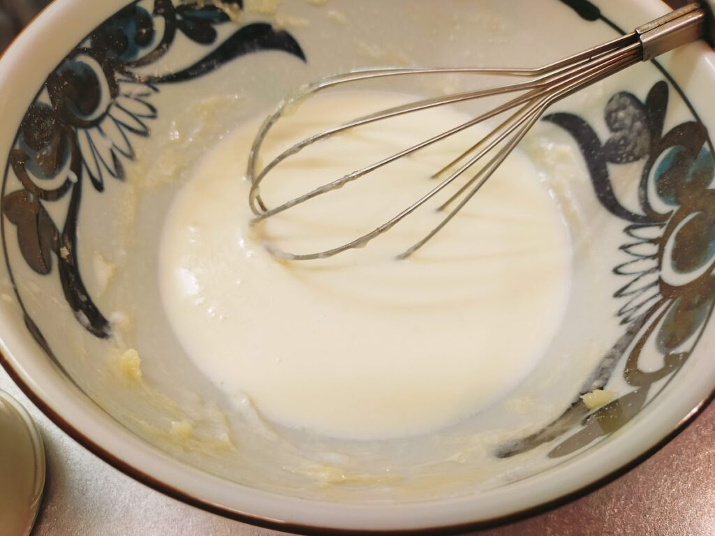- 6に残りの牛乳を2回に分けて入れながら、そのつどよく混ぜます。