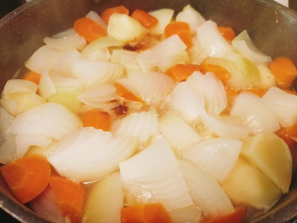 - 野菜の鍋が沸騰して10分ほどしたら、コンソメと砂糖と2を入れて、じゃがいもが柔らかくなったら火を止めます。