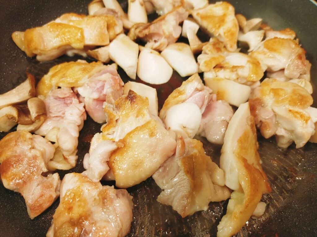 - 鶏肉を一口大の大きさに切って、軽く塩をふって皮目を下にして、フライパンに並べて火にかける。好みのキノコ類があれば、一緒にフライパンへ。