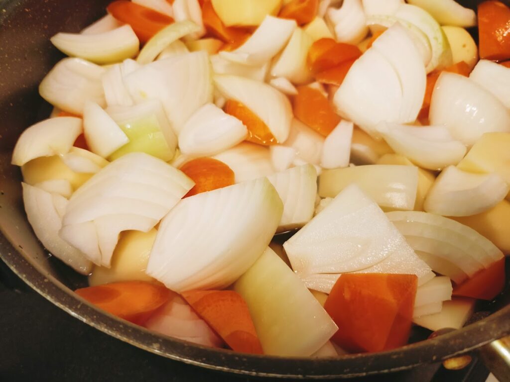 - 野菜を食べやすい大きさに切って鍋に入れ、ひたひたになるくらい水を入れて中火にかける。