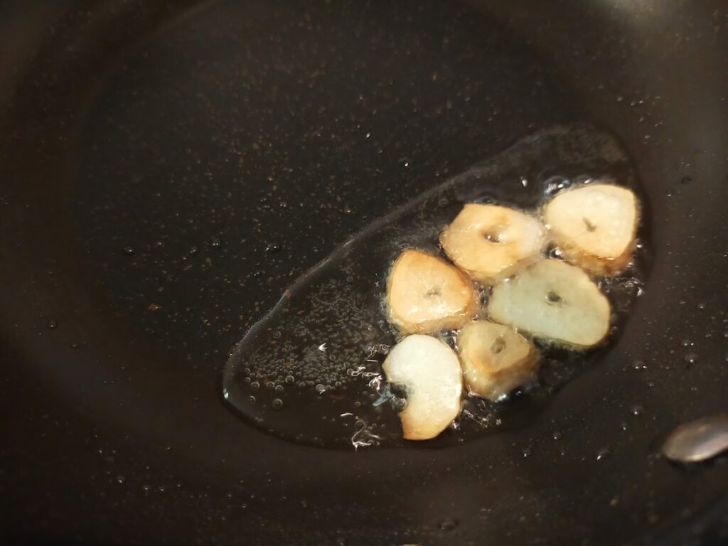 - フライパンに油を入れ、スライスしたにんにくを入れて弱火にかけます。
