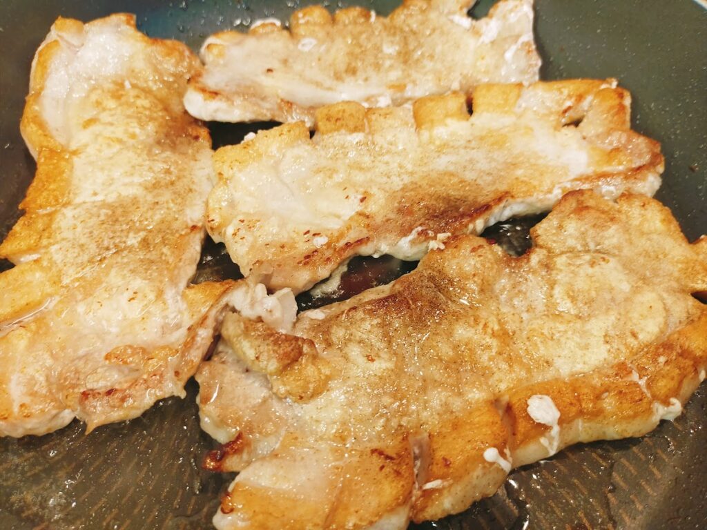 - 肉を入れたら、触らずに(触ると小麦粉がはがれてしまうので)こんがり焼き色がつくまで片面焼きます。
