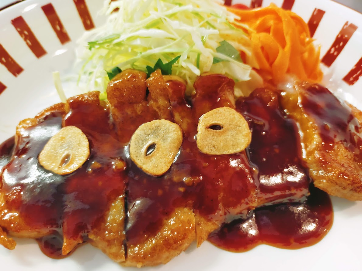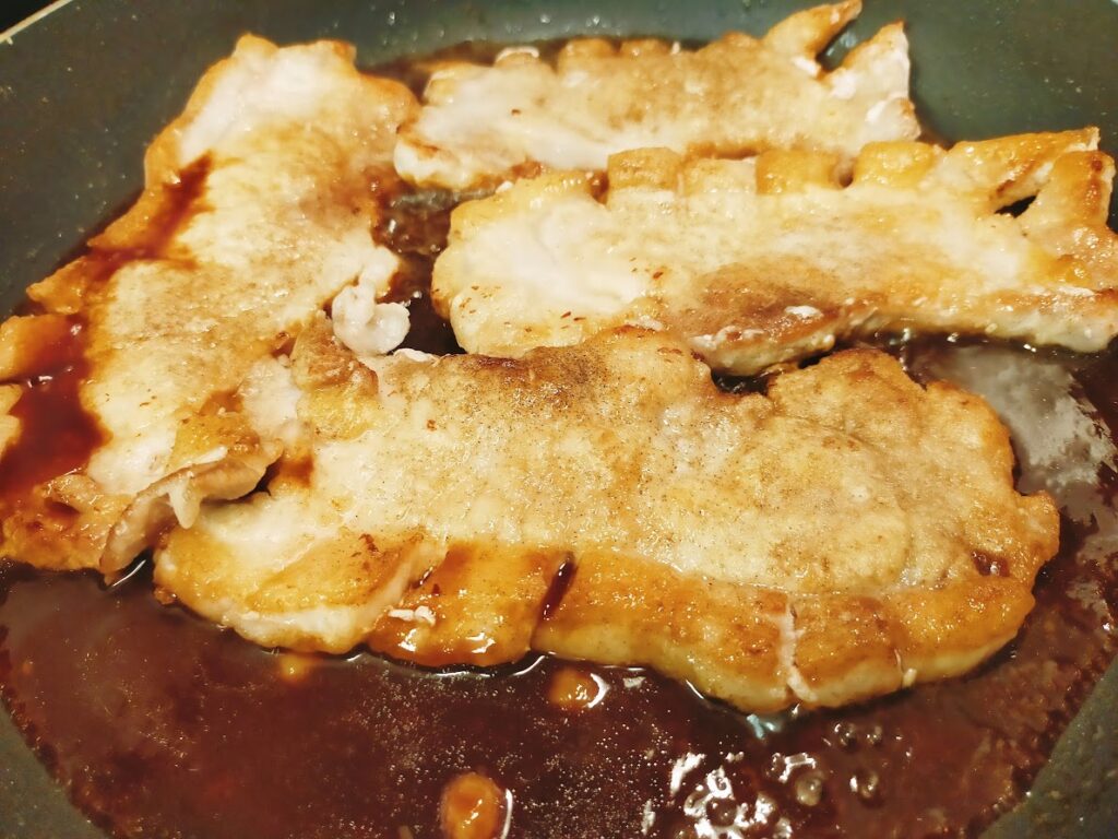 - 調味料を肉の両面にからめたら、肉を取り出して皿に盛りつけ、残った調味料を軽く煮詰めて、少しとろみがついたら、肉にかけて出来上がり。千切りキャベツと共に召し上がれ。