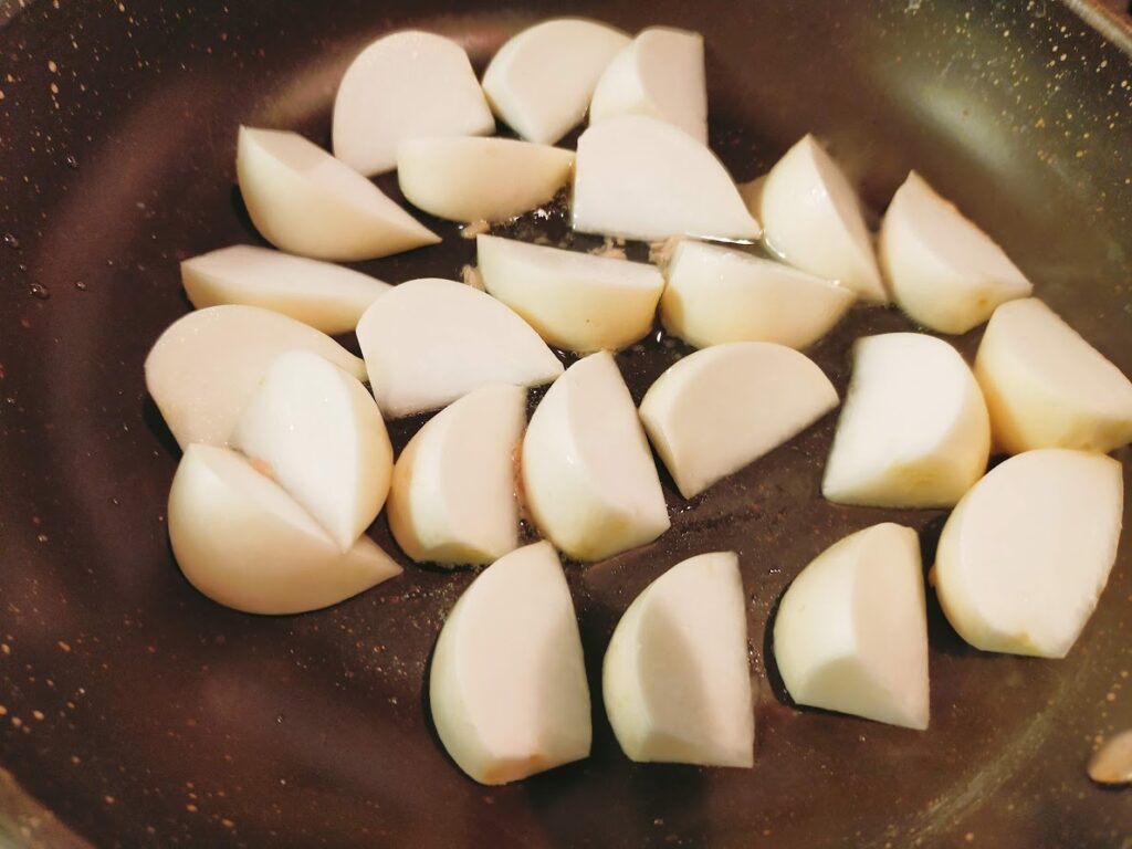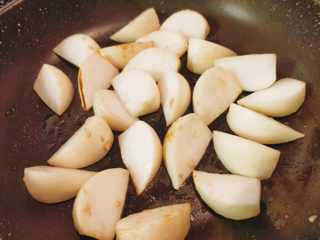 - かぶの白い部分を入れて中火にします。