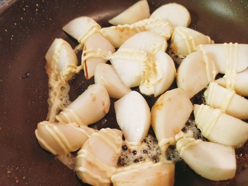 - こんがり焼き目がついたら、マヨネーズを適量回し入れます。