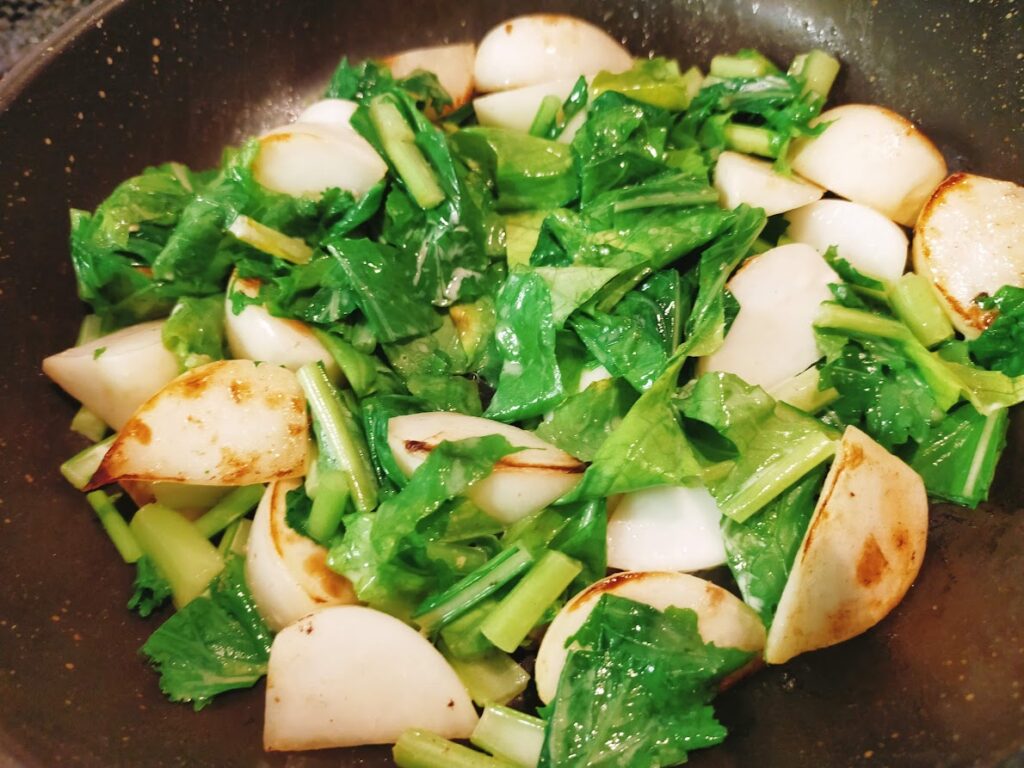 - 5にかぶの葉も入れて、混ぜます。