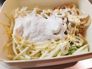 - 2に小麦粉と片栗粉を同量、まぶしていきます。