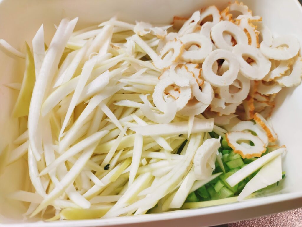 - 大根の皮を細く切り、ちくわは、輪切りにします。
