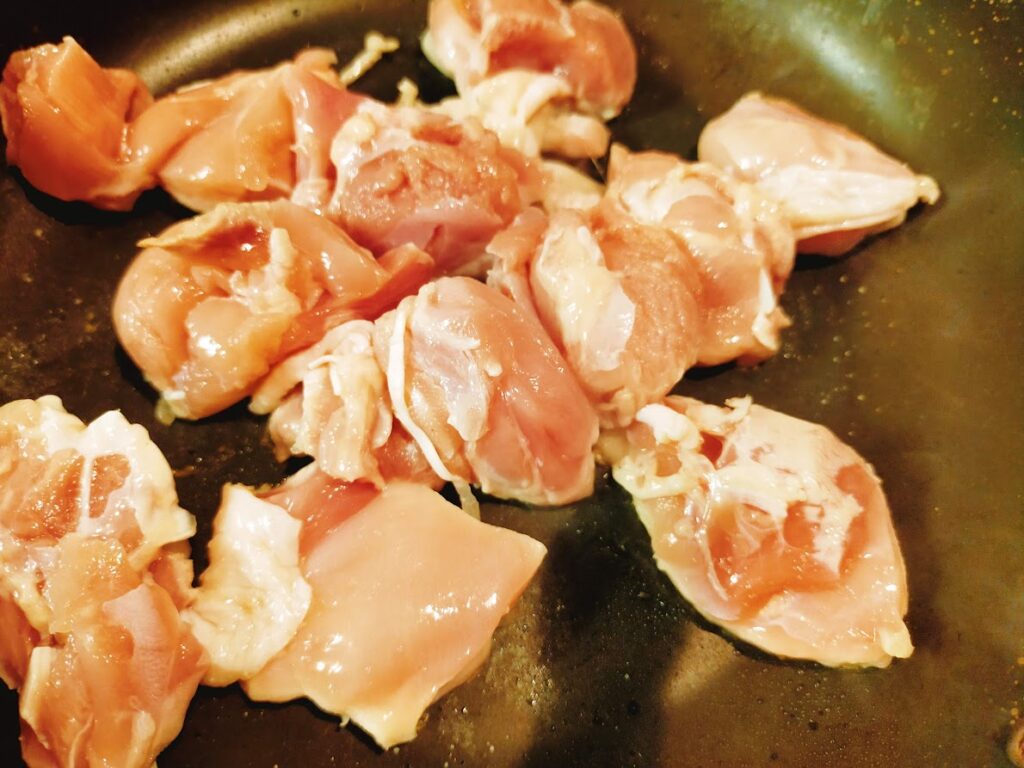 - 鳥もも肉を一口大に切り、軽く塩コショウをします。