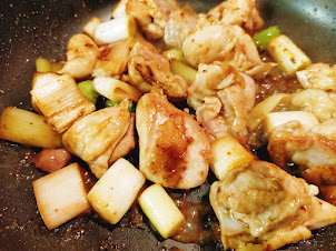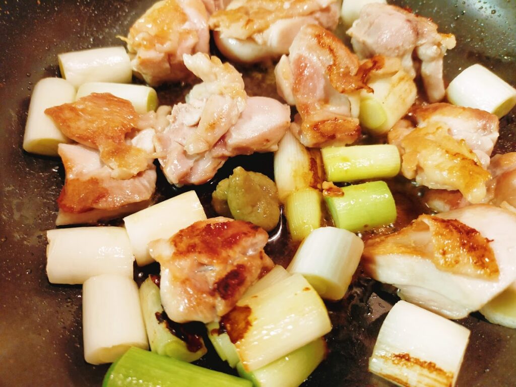 - 4のフタをあけて、鳥の皮目に焼き色が付くまで火を通せば、鳥とねぎを裏返します。
